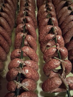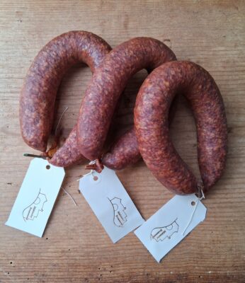 Aus diesem hochwertigen Fleisch lassen wir außerdem feine Würste herstellen. Die Fleischerei Schubach in Heiligental fertigt für uns saftige, runde Knackwürste mit dezenter Würzung von Kümmel und Knoblauch sowie eine besondere, im Rauch gereifte Salami-Variante, die das traditionelle Handwerk unserer Region widerspiegelt.