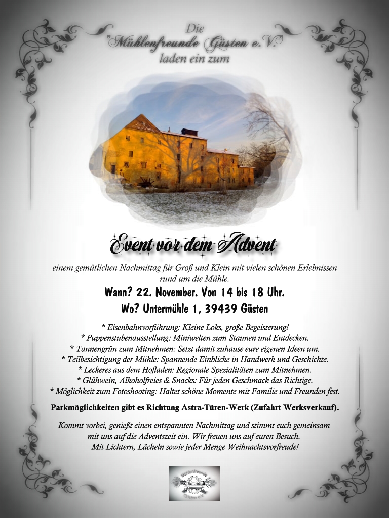 Unser Verein Mühlenfreunde Güste e.V ladet zum 22.11.2025 zu einem Event ein. Sie sind herzlich willkommen!